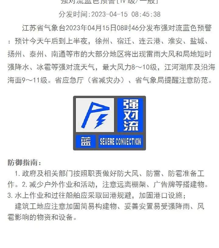 江苏省气象台发布强对流蓝色预警
